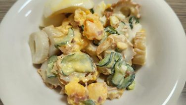 ぷりっと卵に、ちくわの旨みときゅうりのシャキ感が絶妙!マヨとめんつゆがまろやか&コク深く、鰹節の香りが全体をまとめる最強おかず系サラダの一品!