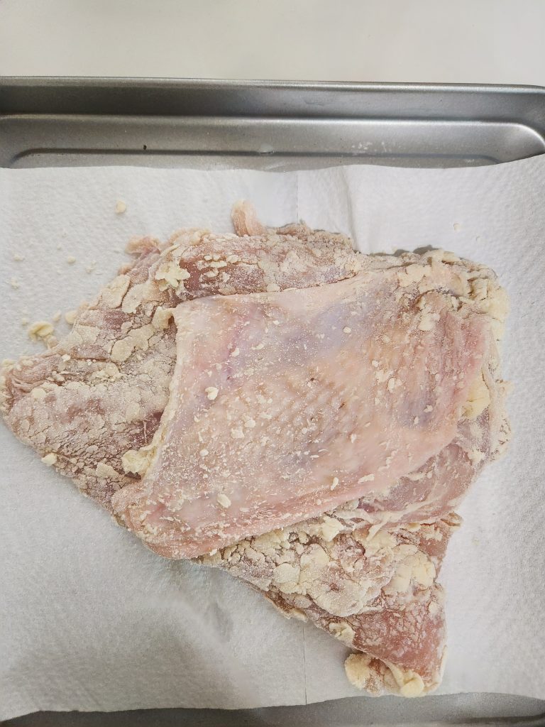 鶏むね肉に小麦粉をまぶす。