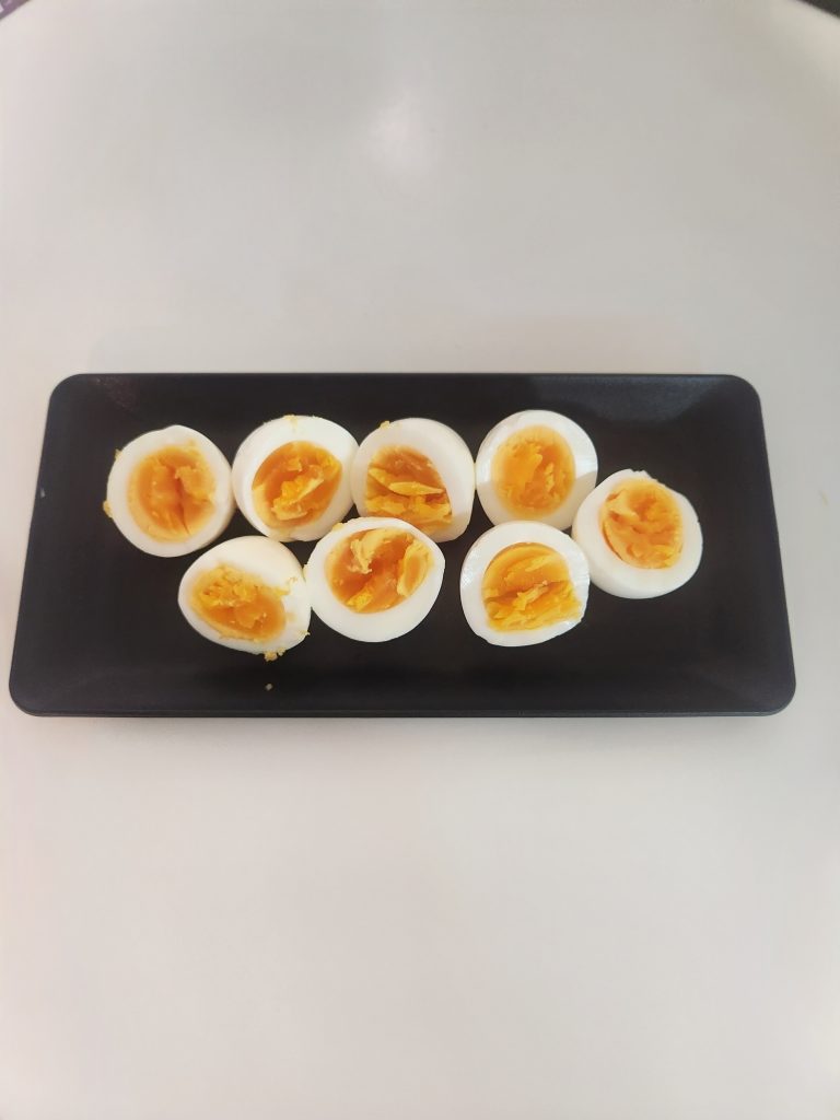 ⑤ 殻をむき半分に切り、皿に盛る。